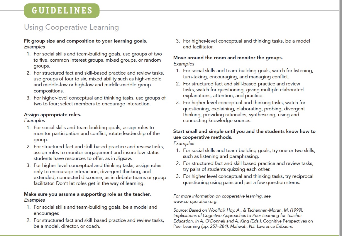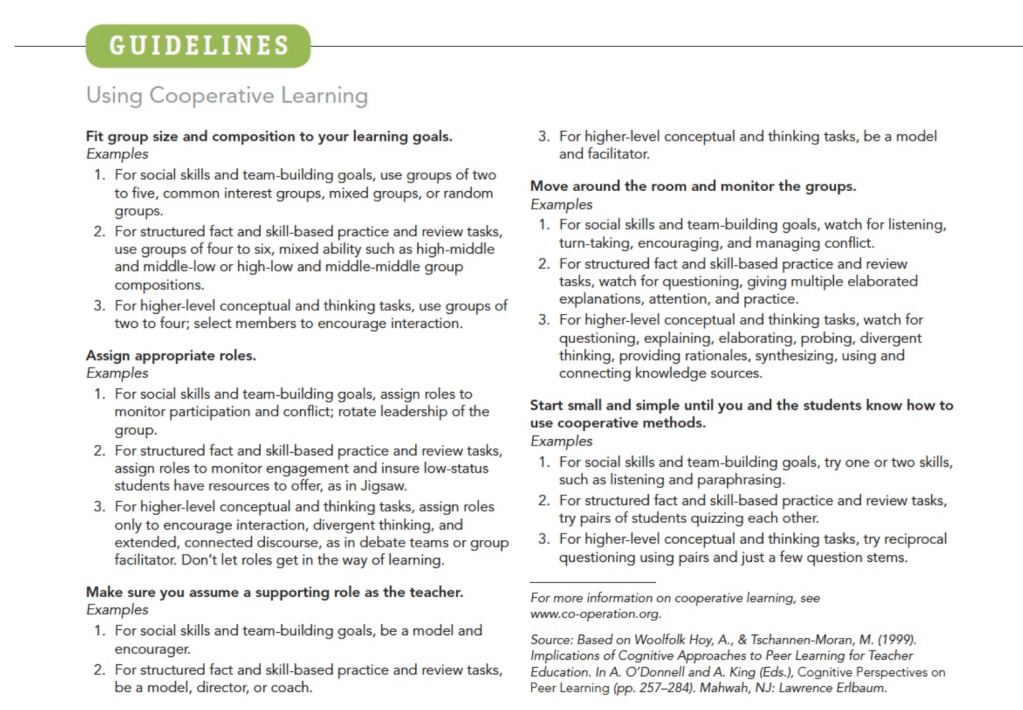 Woolfolk Hoy, A., & Tschannen-Moran, M. (1999). Implications of cognitive approaches to peer learning for teacher education. Cognitive perspectives on peer learning, 257-284